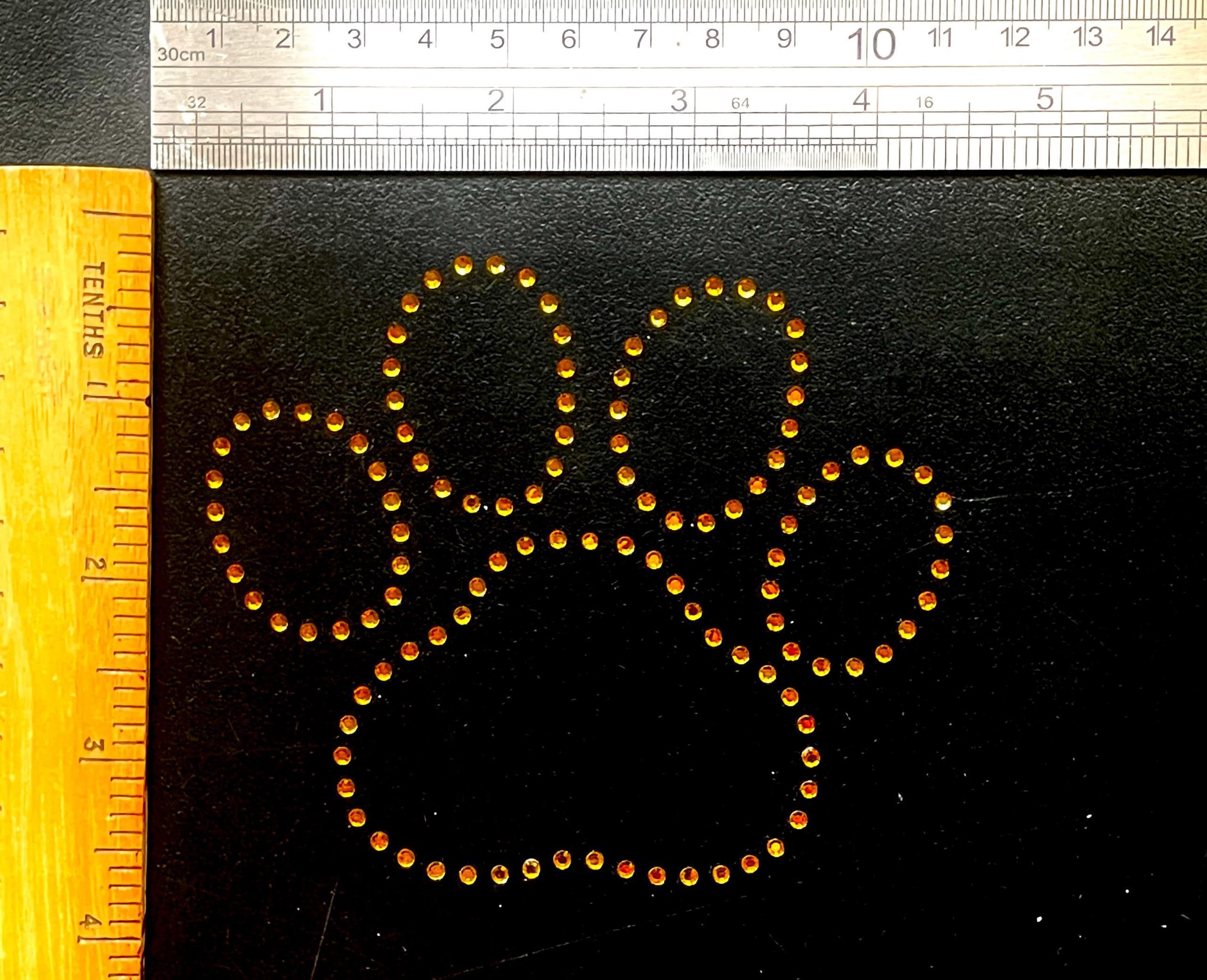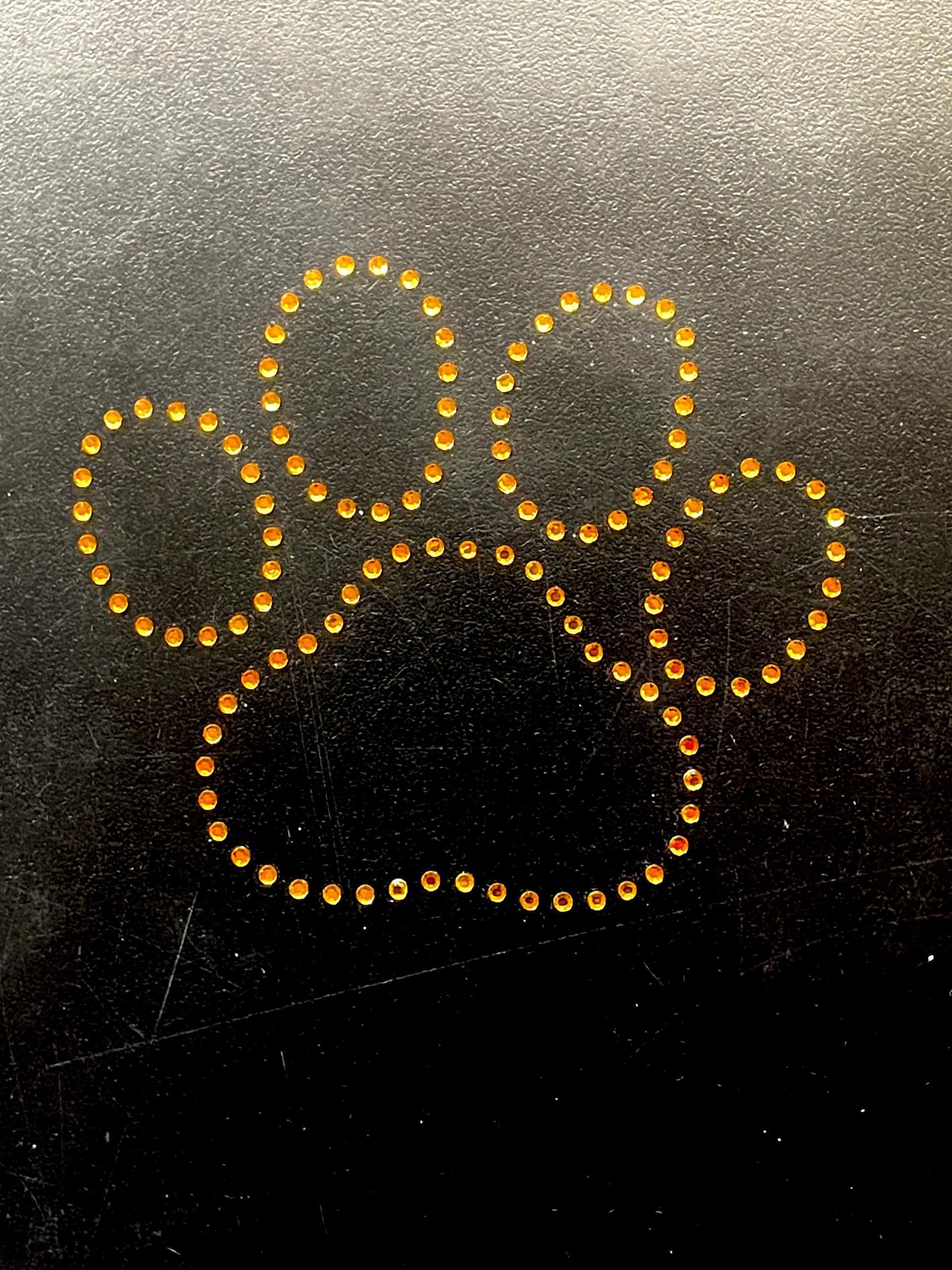 Elevate your garments with this stunning golden rhinestone iron-on paw print transfer! Perfect for personalizing T-shirts, bags, or other heat-resistant fabrics, this design combines elegance and versatility for all your DIY projects.